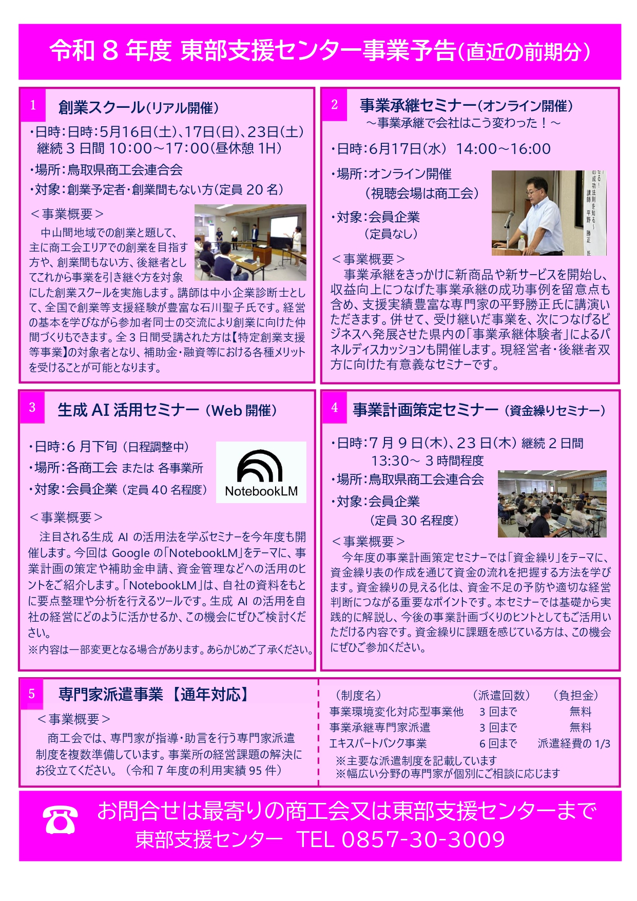 ◆開催予定セミナー ①創業スクール:5/16、5/17、5/23 ②事業承継セミナー:6/17 ③生成AIセミナー:6月下旬 ④事業計画策定セミナー(資金繰りセミナー):7/9、7/23 ⑤専門家派遣事業:通年対応