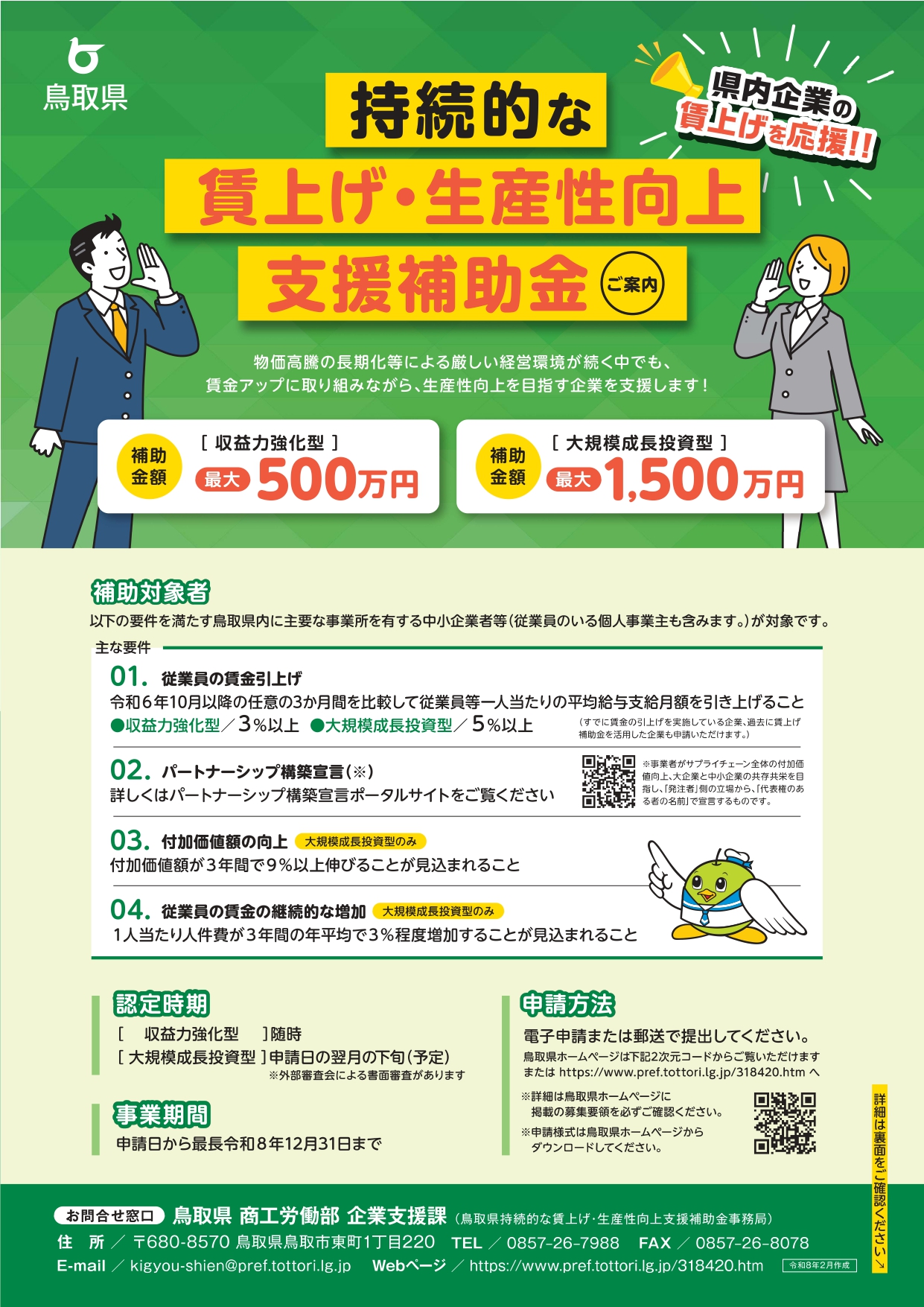 詳細は、県HPにて募集要項をご確認ください。 持続的な賃上げ・生産性向上支援補助金の募集/とりネット/鳥取県公式サイト